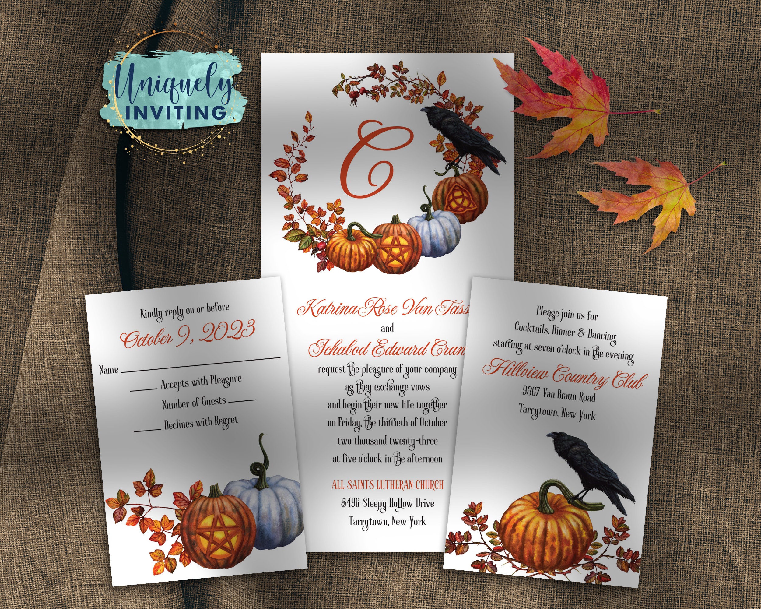 This listing is for a sample set of our “Samhain Wreath” Wedding Invitations. We can’t get enough of these watercolor illustrations depicting fall leaves, carved pumpkins, and a raven! Personalize the wreath with an initial, monogram, names, wedding date, or even a symbol. The sample is pictured in Black and Sienna inks.